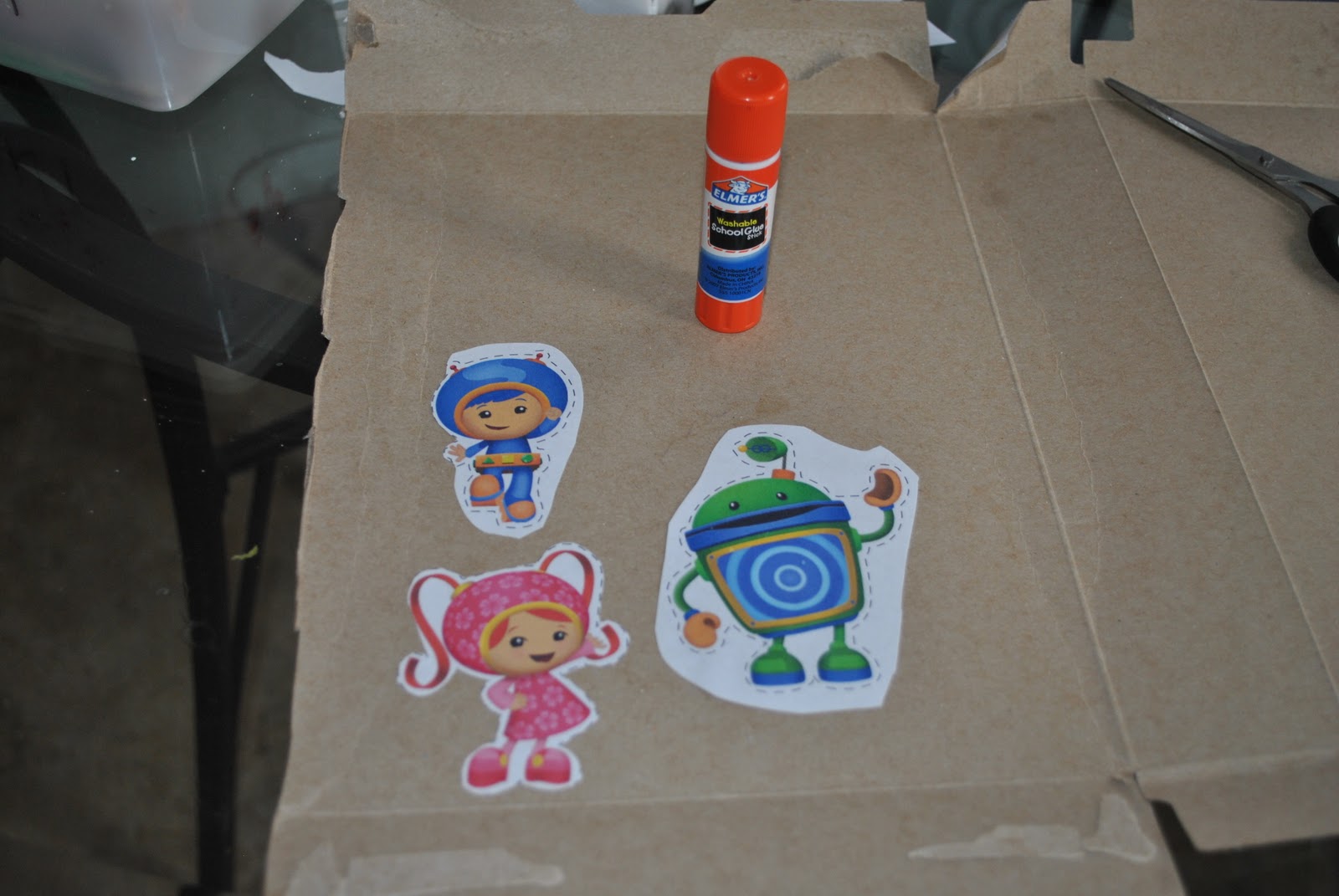 Rough cut around characters on print-out (we used Team Umizoomi printables from Nick Jr.)