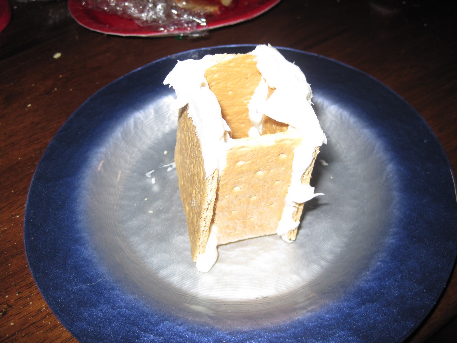 Step 3: Snap another big graham cracker in half, dab some frosting on the edges, and make a pointed roof. Note: My roof slipped several times because I had too much frosting, but it stayed put after a minute.