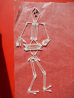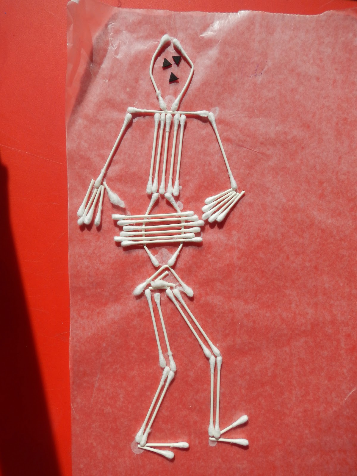 Lay out the cotton swabs on the wax paper or other paper and arrange into the shape of a skeleton as shown in the picture. Dab glue at the joints. Add a face with black marker or little pieces of black paper ( you can even use black parts of magazine photos if you don't have craft paper).