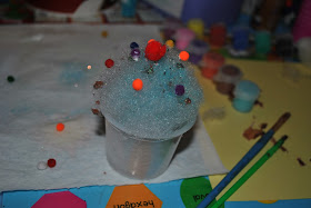 My son really wanted to use some glitter. So he sprinkled the Martha Stewart glitter (which is very fine) over the "Ice Cream". I think it now looks like Cotton Candy -- which gives me a whole new idea for a craft. Maybe Cotton Candy Ornaments? Since the glitter is so fine, we didn't even use glue.