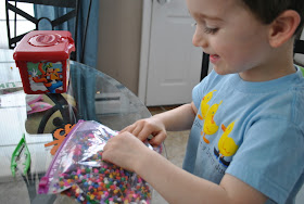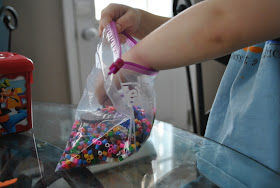 Today I broke out the melt beads (we have the Pyssla beads from Ikea) right after lunch.  My 4-year old loves the thought of doing melt bead crafts, but he doesn't have the patience or fine dexterity to really do this craft without a complete meltdown.  Very quickly our craft turned into an archaeological dig with him hiding tiny toys in the bin.  So instead of making the traditional coaster, keychain, or ornament we made a very simple Peek-A-Boo bag.  What's a Peek-A-Boo bag?  It's a little quiet activity that lets your little one find treasures hidden in a bag.  They can smoosh and shake the bag to uncover their lost items.  There are plenty of places to buy fancier versions or you can easily sew one together.  This is the preschooler-can-do-it-theirself version all in 5 minutes without sewing or glueing!