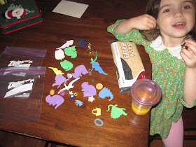 My daughter was throwing a fit that she didn't have a pair of dino-feet, so I made her little baby T-Rex feet.  These cut-outs that went over the top of her little barefoot feet.  How cute?  She was in love.  I have a feeling in the very near future we will be making some sparkly shoes or ballerina slippers using a similar technique.