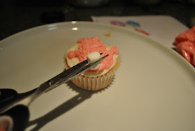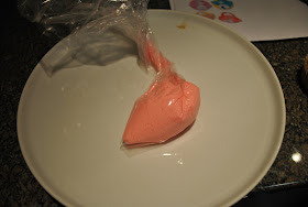 Add pink frosting to the baggie.  Twist the open end and squish all of the frosting to a bottom corner of the bag.  Snip a small corner off the baggie with scissors.