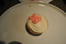 Place the pieces on the cupcake to make the Care Bear's face.  Add the belly badge.  Voila!  In this picture I also added to little marshmallow bits for the ears.  I guess they're optional.