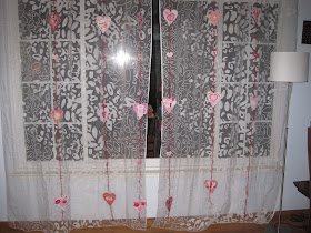 Cut out a bunch of hearts, decorate them, and tape them to your yarn to make a garland.  Hang your garland vertically from a curtain rod, or drape it or tack to a wall, depending on the space you're decorating.