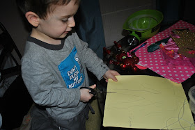 Why I Like This Craft:  It's so easy with only a few supplies!  Plus, my son thinks this is super cool.  It allowed us to do a little pretend play (which I'm sure there will be more time tomorrow to stomp around like dinosaurs) and give us another activity for the snow.  Also, as soon as my 20 month old got interested, I started thinking of all kinds of things to make -- little ice skates (this one's for you Erin), princess shoes, or monster feet. If you cover these with construction paper, glue, and glitter you can make some pretty cute little pretend play shoes.  Time was limited tonight, so it mostly was a mommy-craft with playtime by the kiddos.