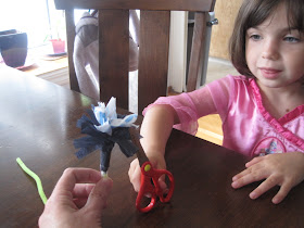 Step 5: Fluff up the petals by pulling down the fringe, starting from the outer ring and working your way to the middle. You can get extra fancy and pull some of the pipecleaner through the middle to make a stamen. Be sure to bend down the sharp edge if you do that. Repeat until you have enough flowers for a bouquet, or your kid gets tired. My four year old made about half of the flowers in the picture and I made the other half.