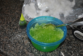 For those of you that don't know me, Halloween is my favorite time of year.  For weeks I've been dreaming up new stuff to make that's within theme for this holiday.  Here's a little recipe to make some easy slime jelly.  I've had this little "trick" stored in the back of my brain since I first learned about polymers as a Girl Scout back in the 80s.  It's still fun to make, and now I always have diapers on hand.