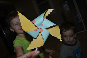 What I Like This Craft:  You can make these pinwheels in any size.  I think they would look adorable grouped together on a streamer for some birthday party decorations.  Aside from the decorations, my kids throughly enjoyed playing with the pinwheels for 2 days.  20 minutes at least were spent in front of the fan watching them spin!