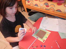 Step 3: Embellish with gems and glittery things (or non-glittery things if that is what your kid likes). Really dig around in your craft drawer to find weird stuff. Did you notice the fuzzy monkey on our mirror? That is from a broken hair clip. Score!